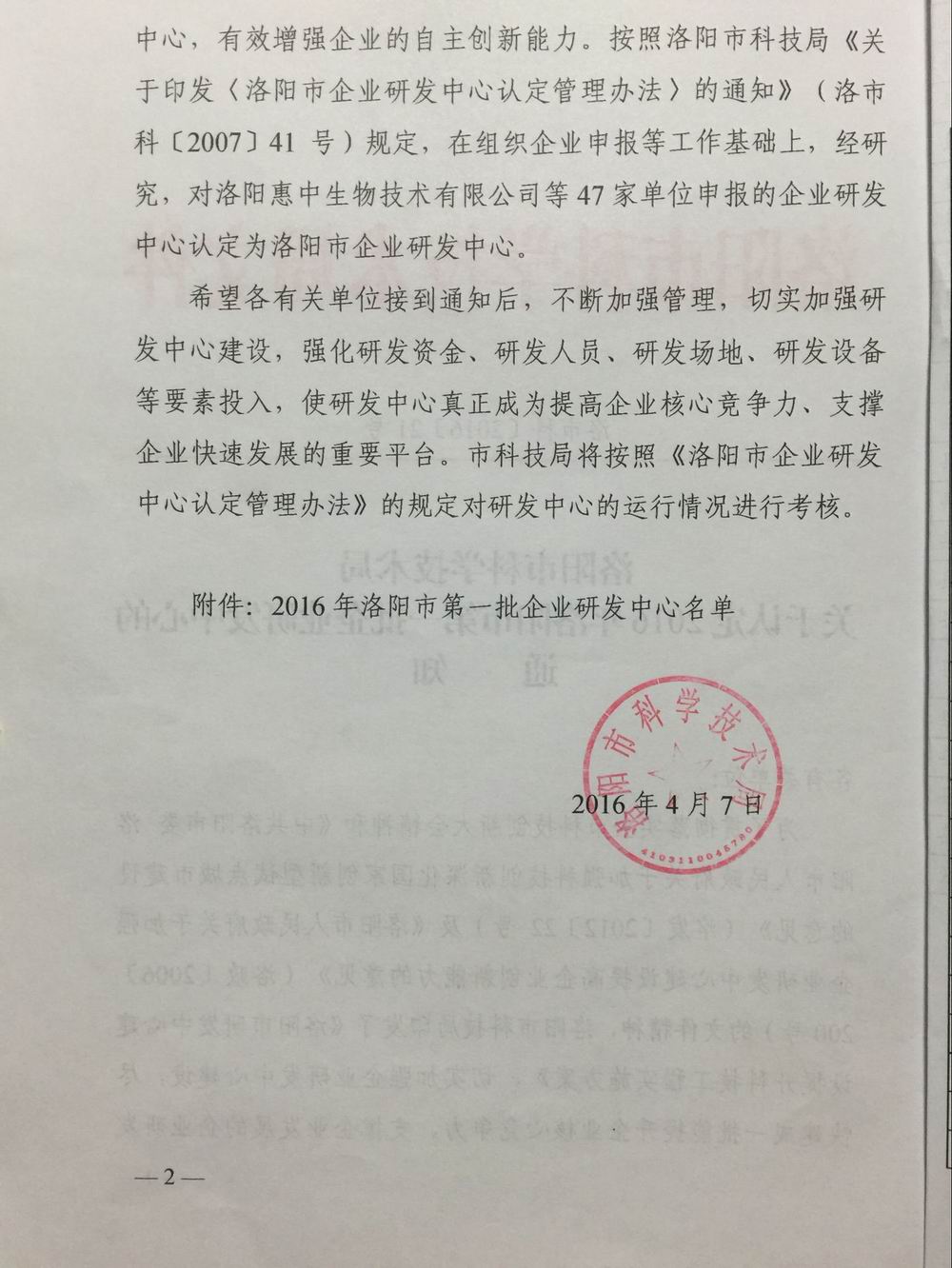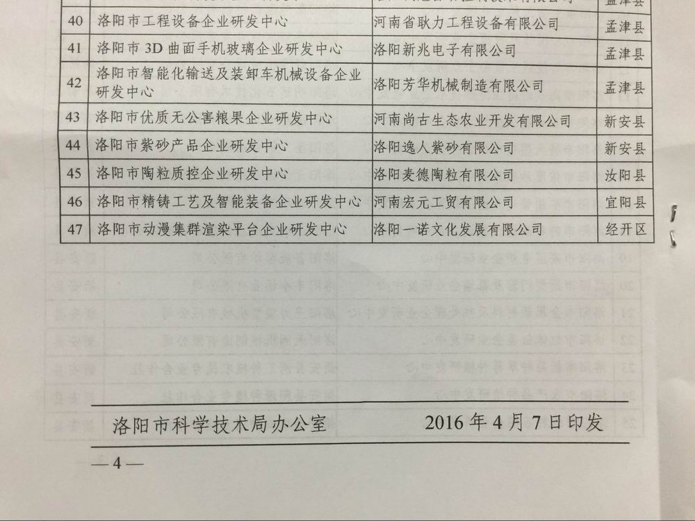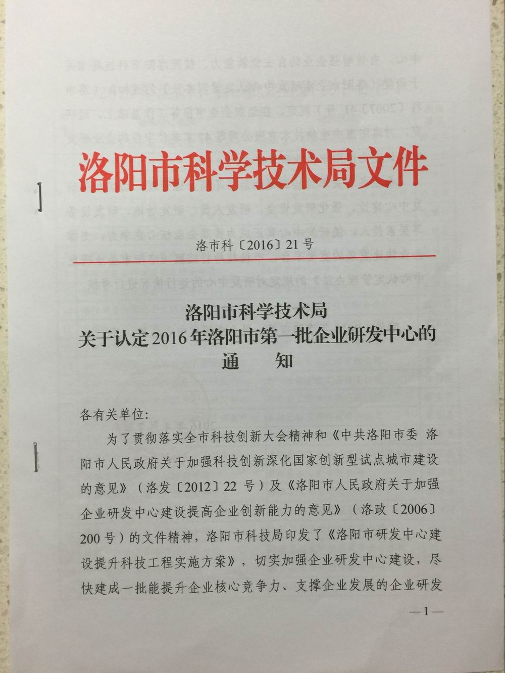 洛陽市科學(xué)技術(shù)局今日下發(fā)了《關(guān)于認(rèn)定2016年洛陽市第 一批企業(yè)研發(fā)中心的通知》,隨著通知的下達(dá),我司企業(yè)研發(fā)中心正式成立!
